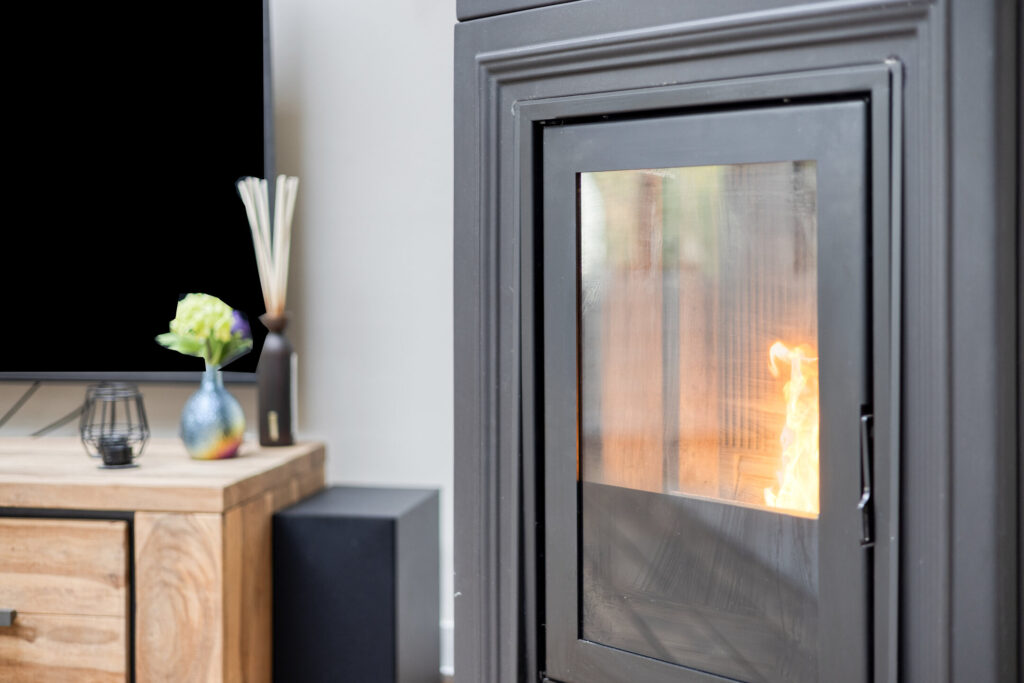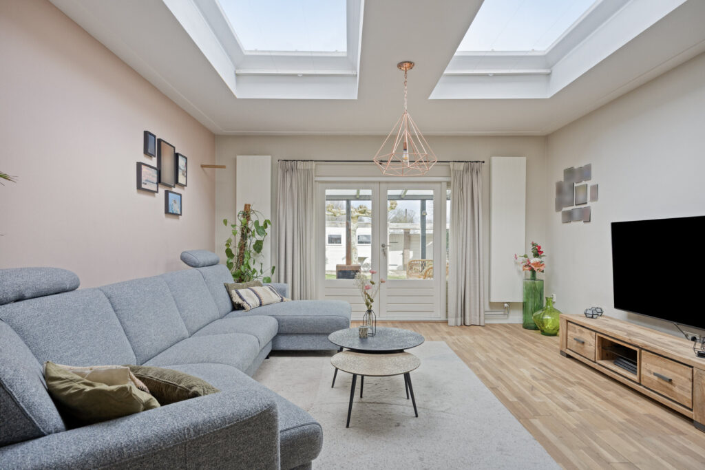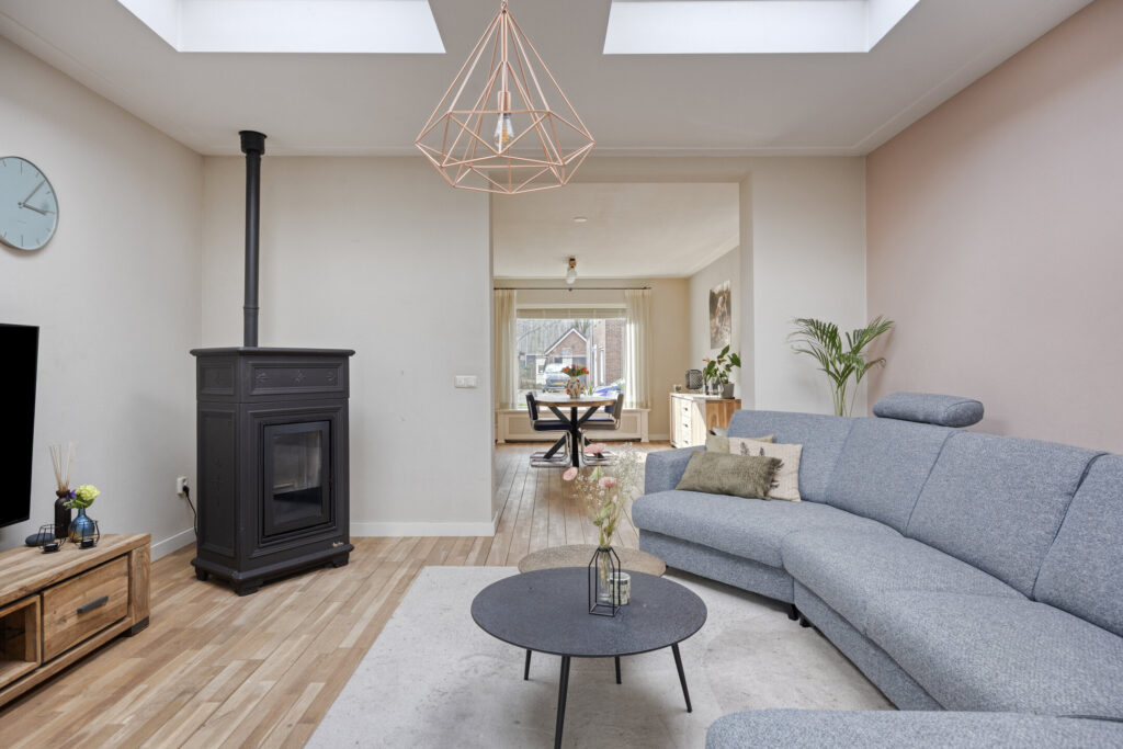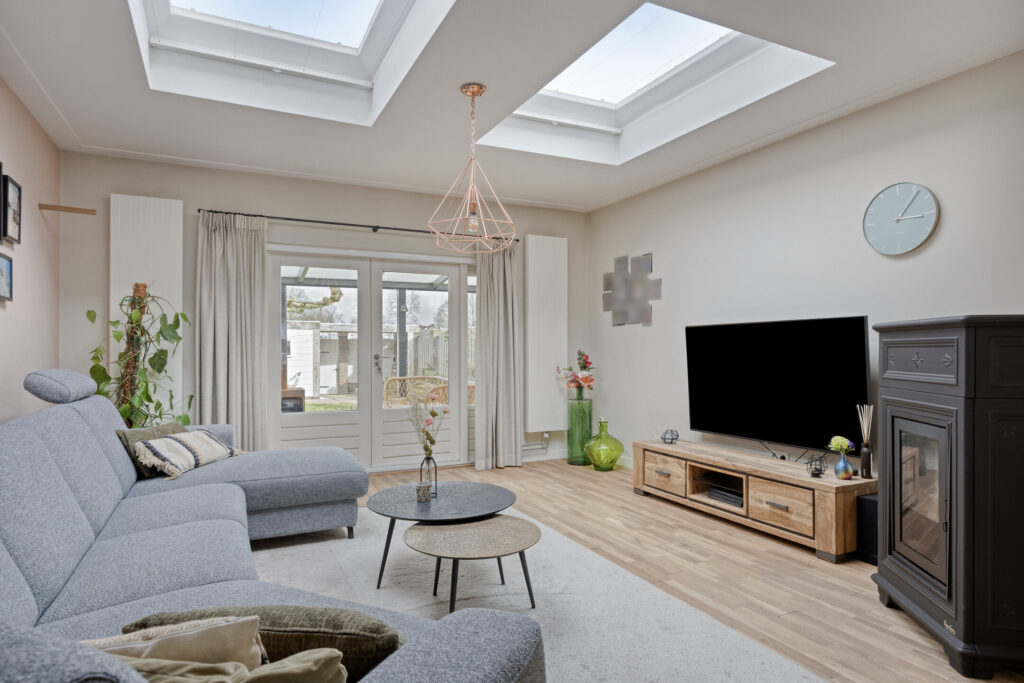 De woonkamer is voorzien van een gezellige pelletkachel (ter overname), lichtkoepels, warme eikenhouten vloerdelen en openslaande tuindeuren naar de achtertuin. Wat een ruimte!