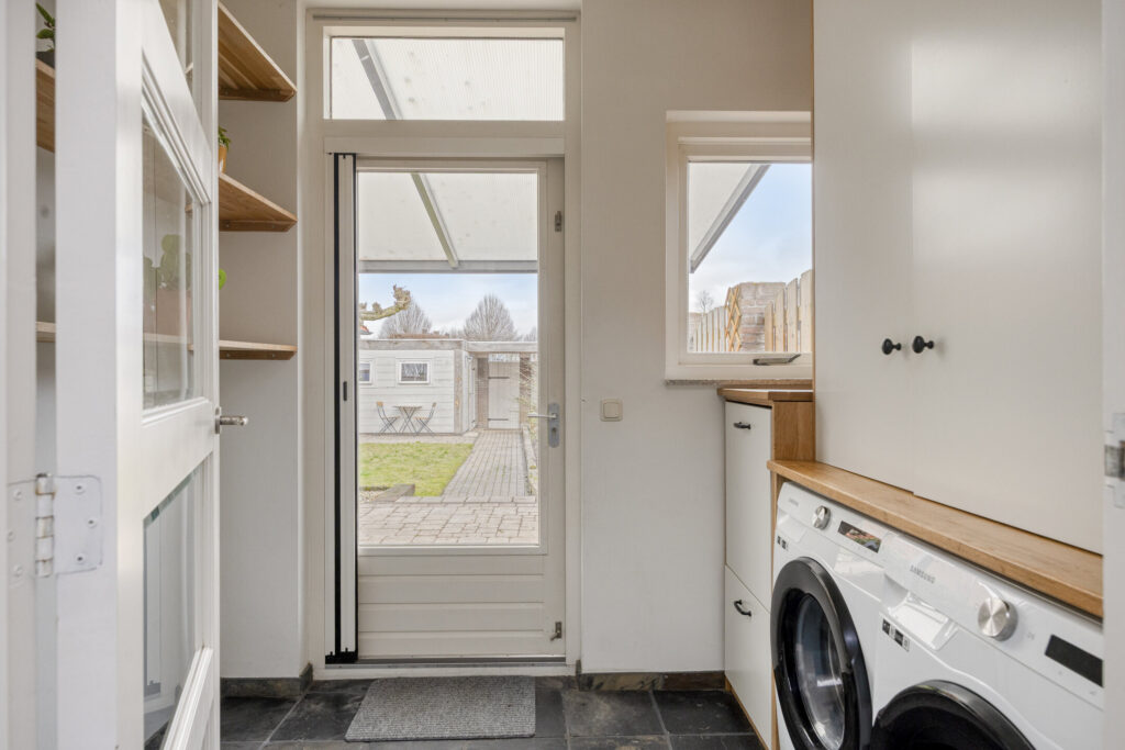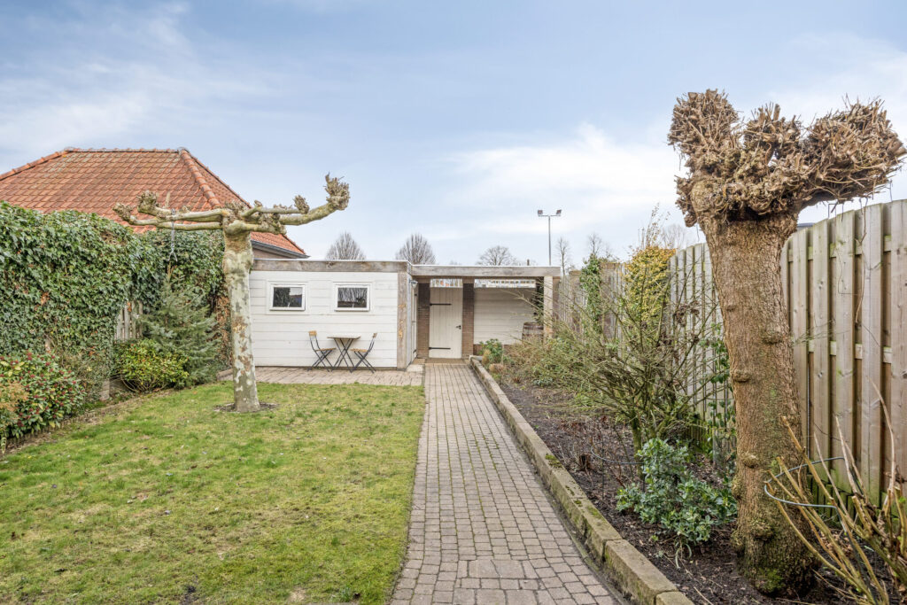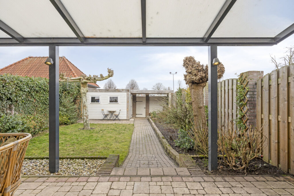 Achterin de tuin staat een ruime geïsoleerde berging met aansluitende overkapping, een multifunctionele ruimte die zich uitstekend leent voor opslag of hobby. Met de fiets kom je hier makkelijk achterom.