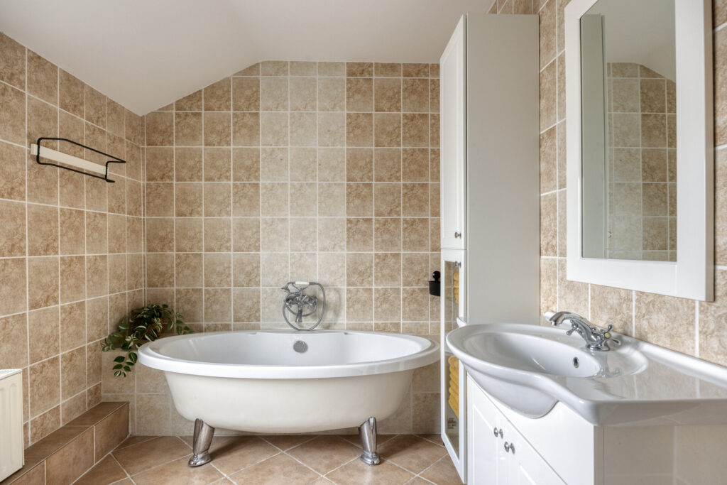 De slaapkamers zijn netjes afgewerkt en beschikken over voldoende daglicht, rolluiken en praktische indelingsmogelijkheden. De badkamer is compleet uitgerust met een vrijstaand ligbad, douche en wastafelmeubel.