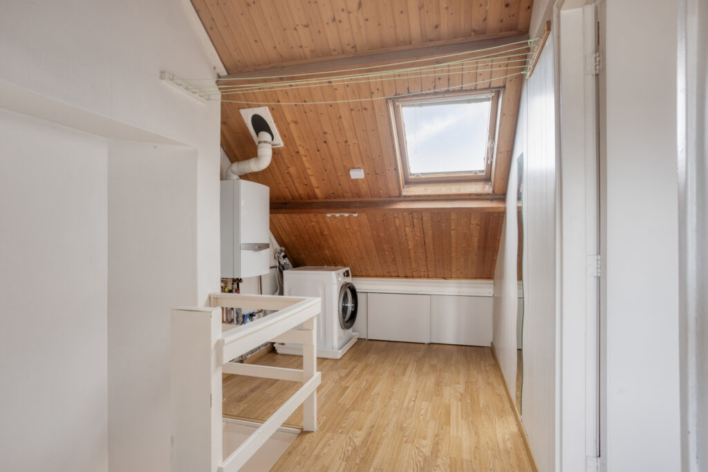 Tweede verdieping: middels een vaste dichte trap naar de voorzolder, berging, opstelling/aansluiting wasmachine/droger en cv- ketel, kleine kamer en een slaapkamer beide v.v. een dakkapel.
