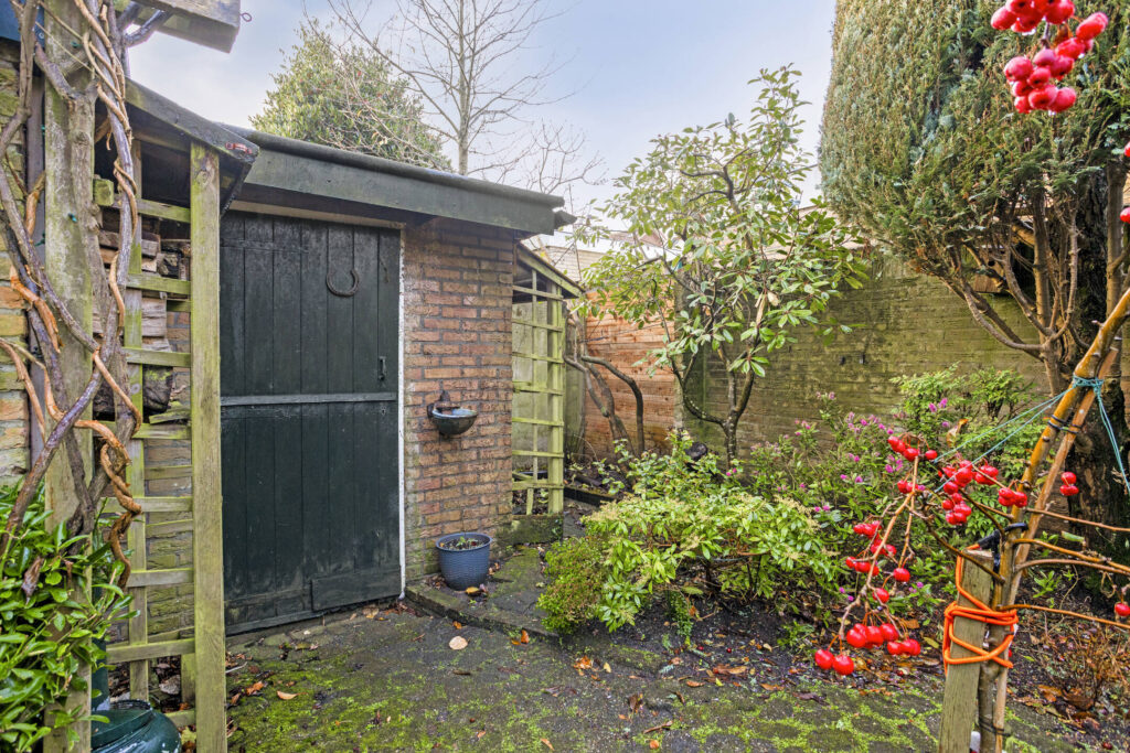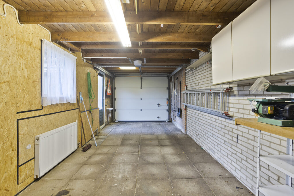 Schuin achter de woning staat een aangebouwde stenen garage en berging. De garage is v.v. elektra, water, verwarming en een elektrische deur.