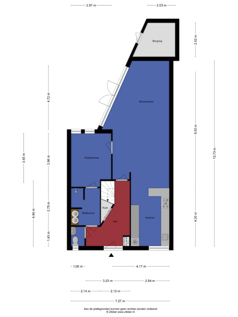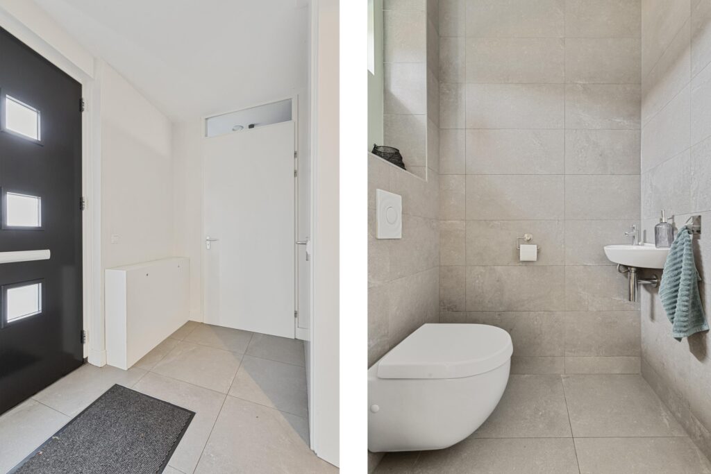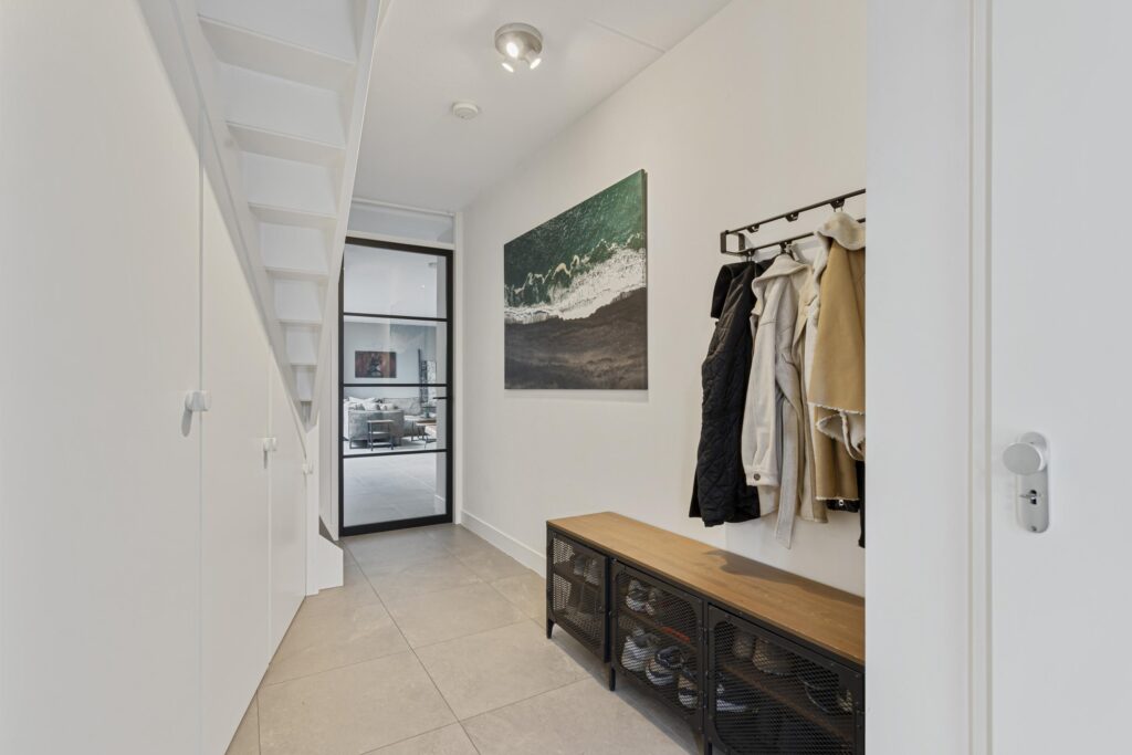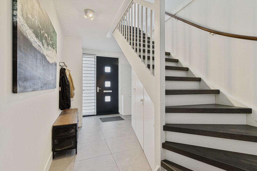 Hal-/entree met tegelvloer, meterkast, op maat gemaakte garderobekast, vaste trapopgang naar de 1e verdieping en toegang tot het toilet, living en badkamer.