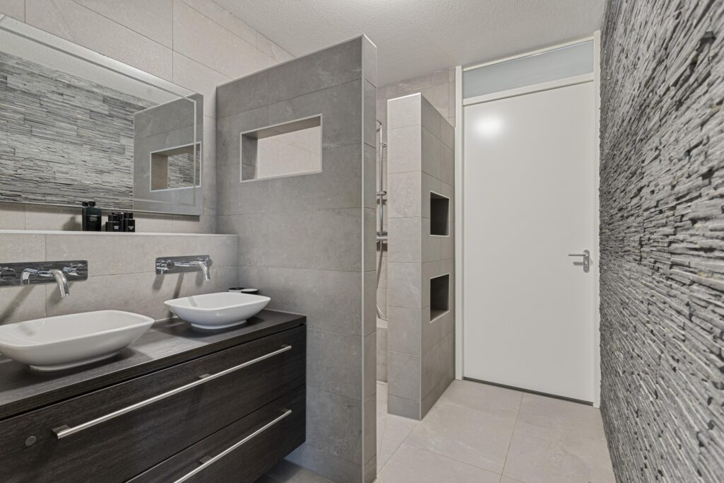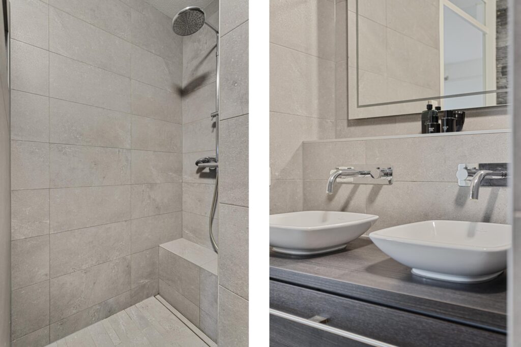 Luxe uitgevoerde badkamer met dubbele wastafel met inbouwkranen, ruime inloopdouche met thermostaatkraan, regendouche, handdouche en ventilatie.