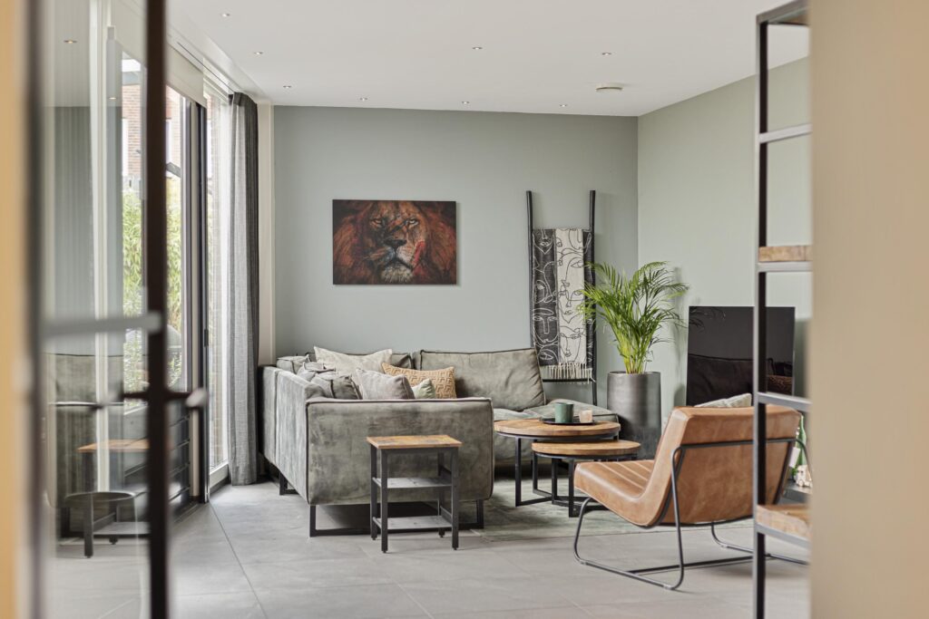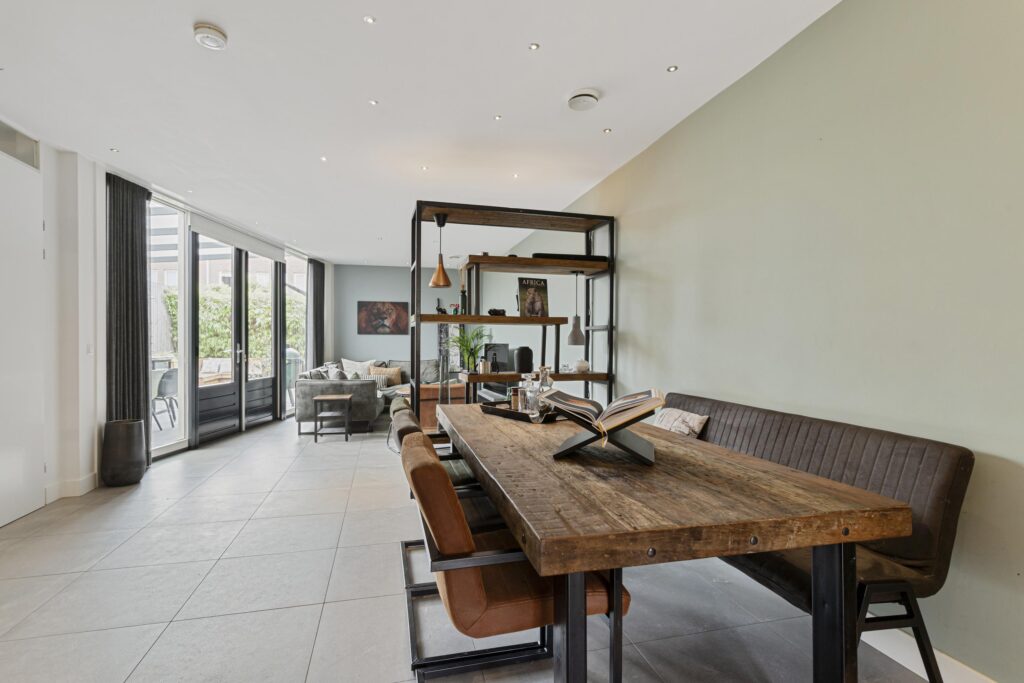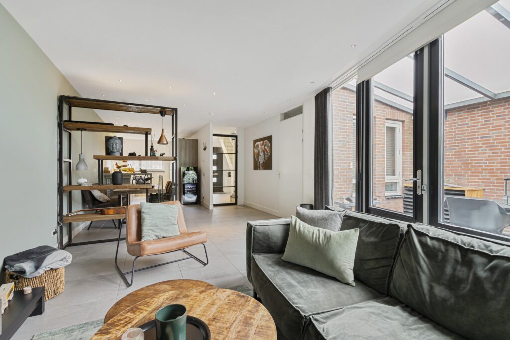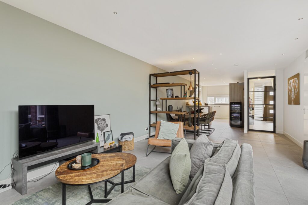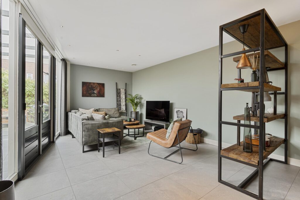 Sfeervolle woonkamer (ca. 32m²) met open verbinding met de keuken aan de voorzijde. De gehele woonkamer is voorzien van stucwerk wand- en plafondafwerking met inbouwspots, tegelvloer en middels openslaande tuindeuren (met plisséhor) is direct tuincontact mogelijk. Vanuit de woonkamer is eveneens toegang tot de naastgelegen slaapkamer.