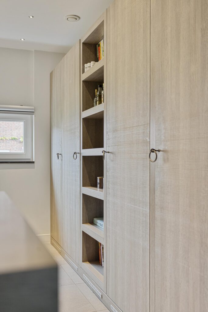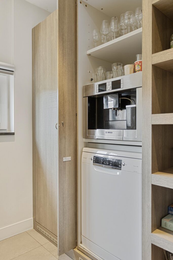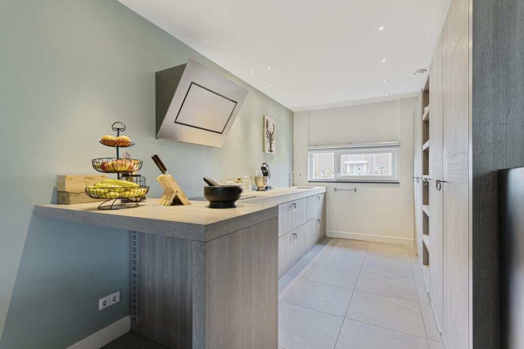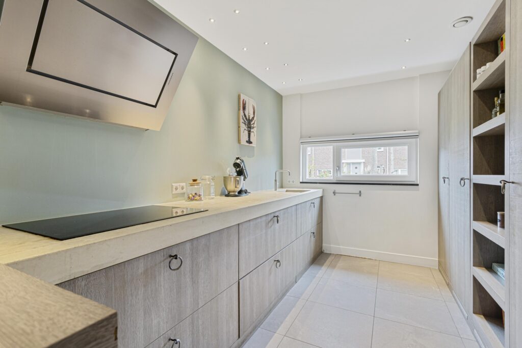 Open, moderne keuken met zitgedeelte en ingedeeld in tweetal wandopstellingen. De keuken is voorzien van een plavuizenvloer en stucwerk wand- en plafondafwerking met inbouwspots en tegelvloer. De keuken is uitgerust met spoelbak met Quooker-kraan, 5-pits inductiekookplaat, afzuigkap (recirculatie), combi-oven, ruime koelkast, losse vriezer, vaatwasser, geïntegreerd koffiezetapparaat en diverse opbergkasten/lades.