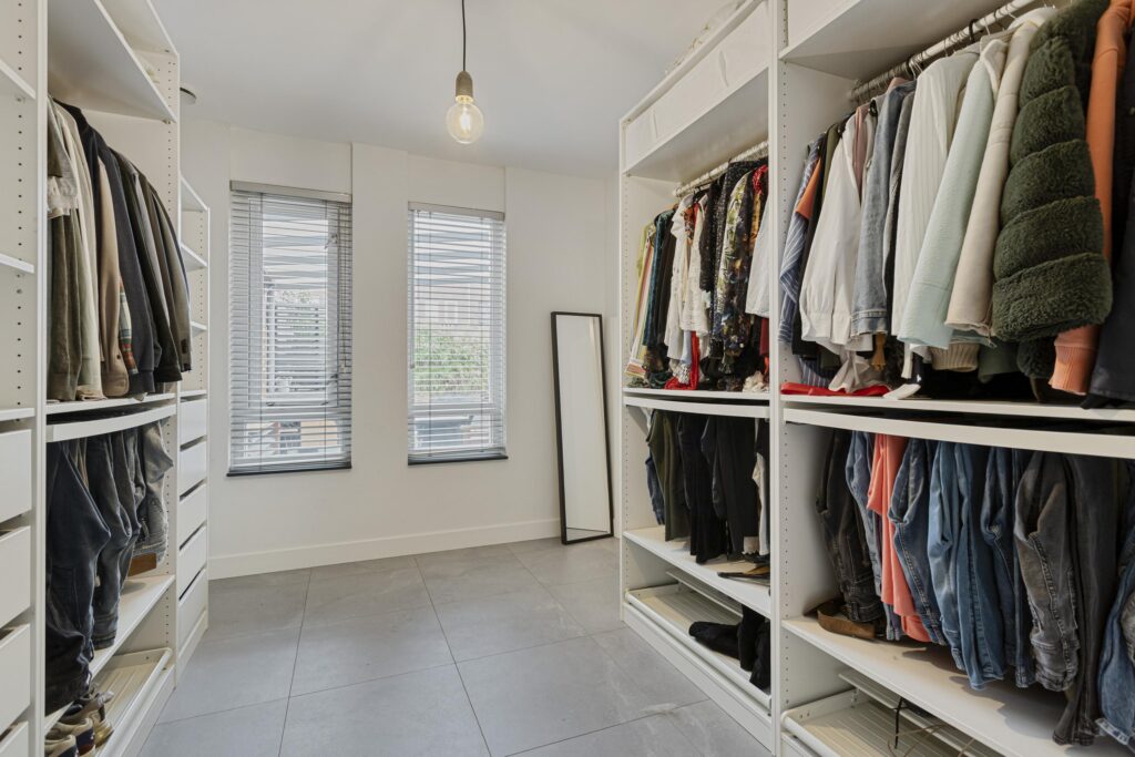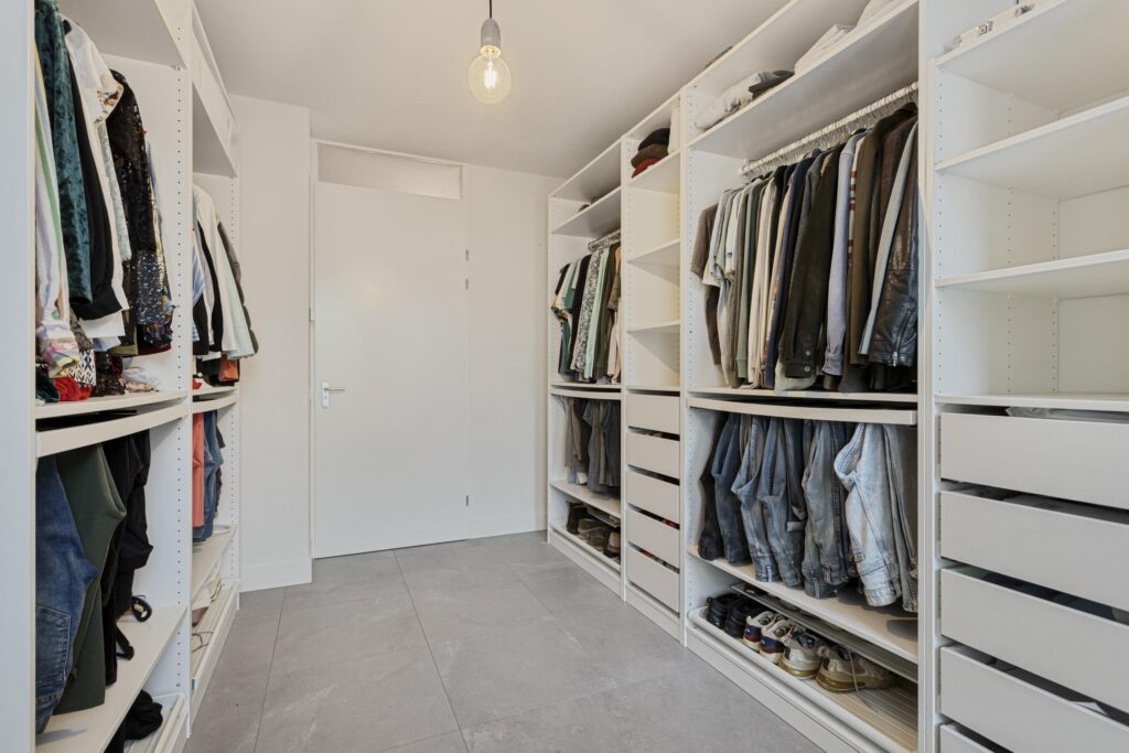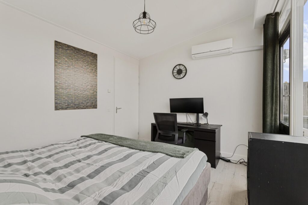 Fijne slaapkamer op de begane grond gelegen en voorzien van strak stucwerk plafond en wandafwerking, airconditioning en tegelvloer. Vanuit de slaapkamer is toegang tot de woonkamer en naastgelegen badkamer. De slaapkamer is thans in gebruik als kastenkamer.