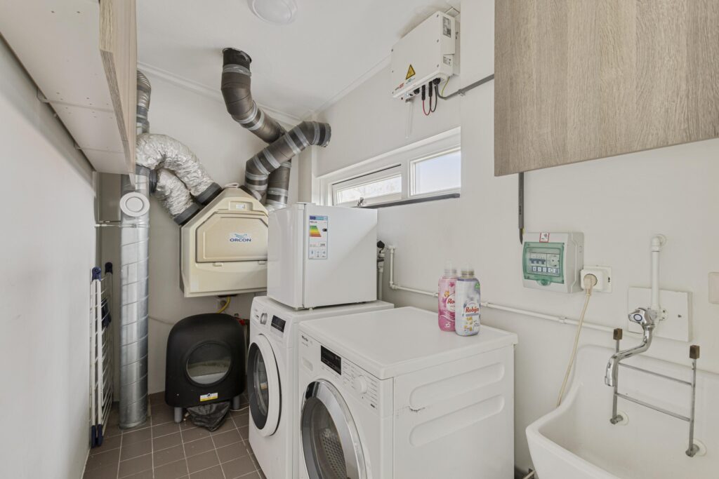 Praktische ruimte met de aansluitingen t.b.v. wasapparatuur, omvormer voor de zonnepanelen, warmte terugwin systeem, uitstortgootsteen en bergkasten.