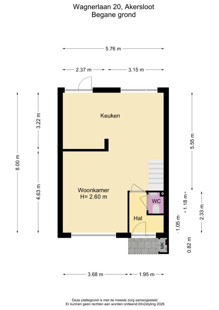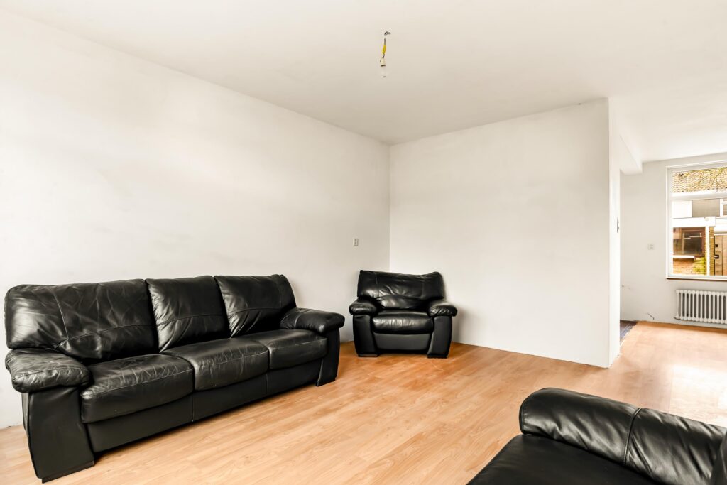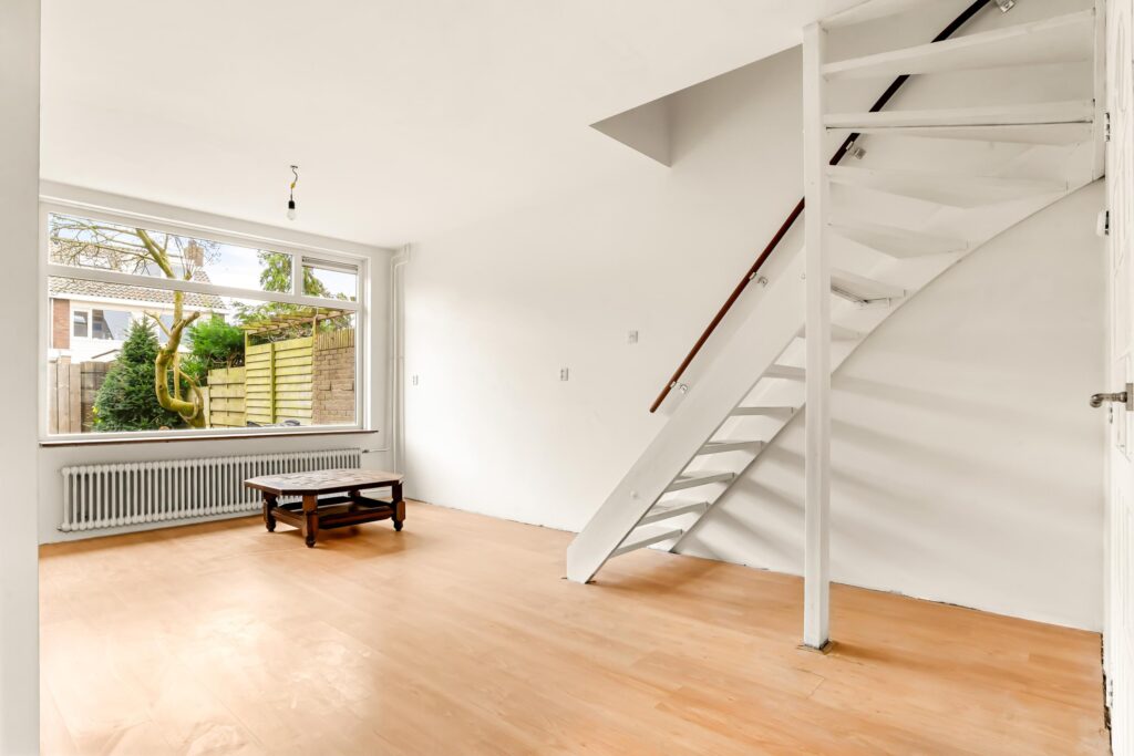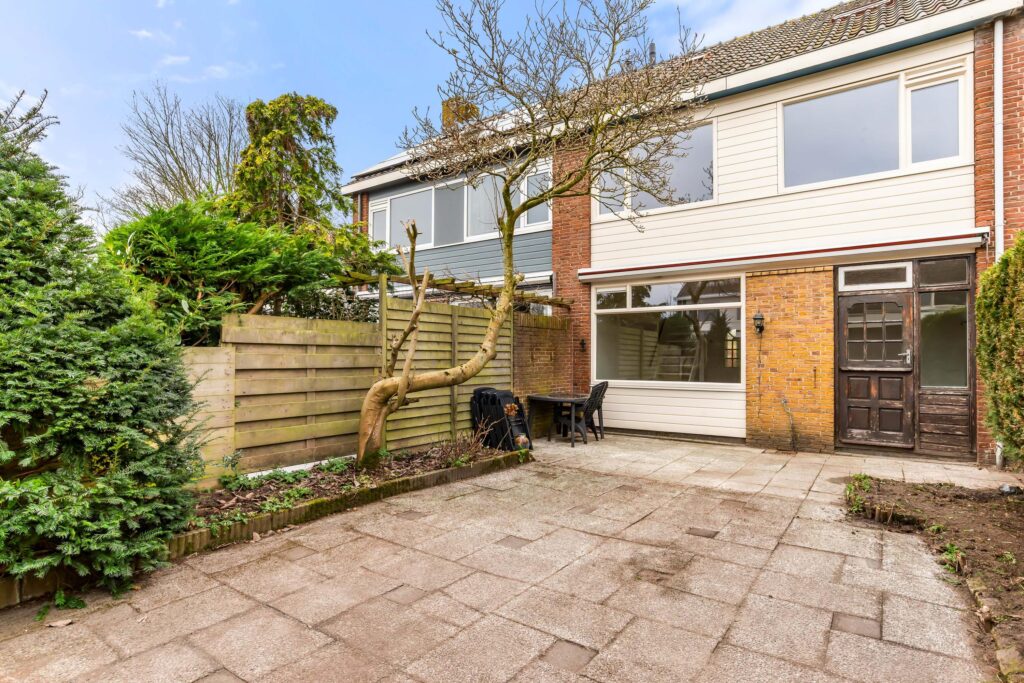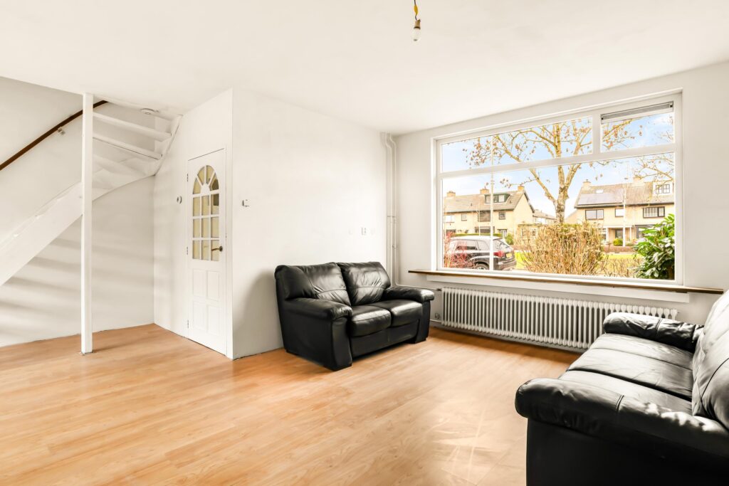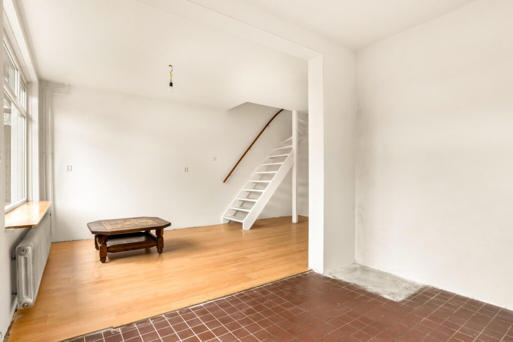 Via de diepe voortuin bereikt u de entree. In de hal vindt u het toilet en de toegang tot de woonkamer. Op de begane grond zijn alle wanden en plafonds strak en glad gestuukt – een perfecte, neutrale basis om uw eigen stijl en kleuren te kiezen. De woning wordt opgeleverd zonder keuken, wat u de unieke kans geeft om direct een keuken te plaatsen die volledig aansluit bij uw wensen. Ook hier zijn de wanden en plafonds recent gestuukt, waardoor u zonder extra voorbereiding aan de slag kunt.