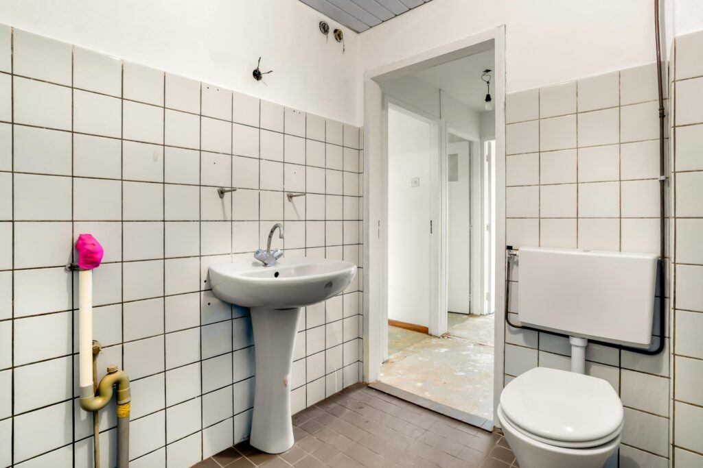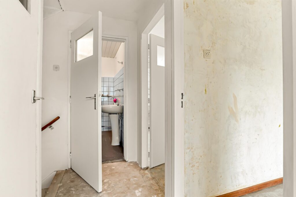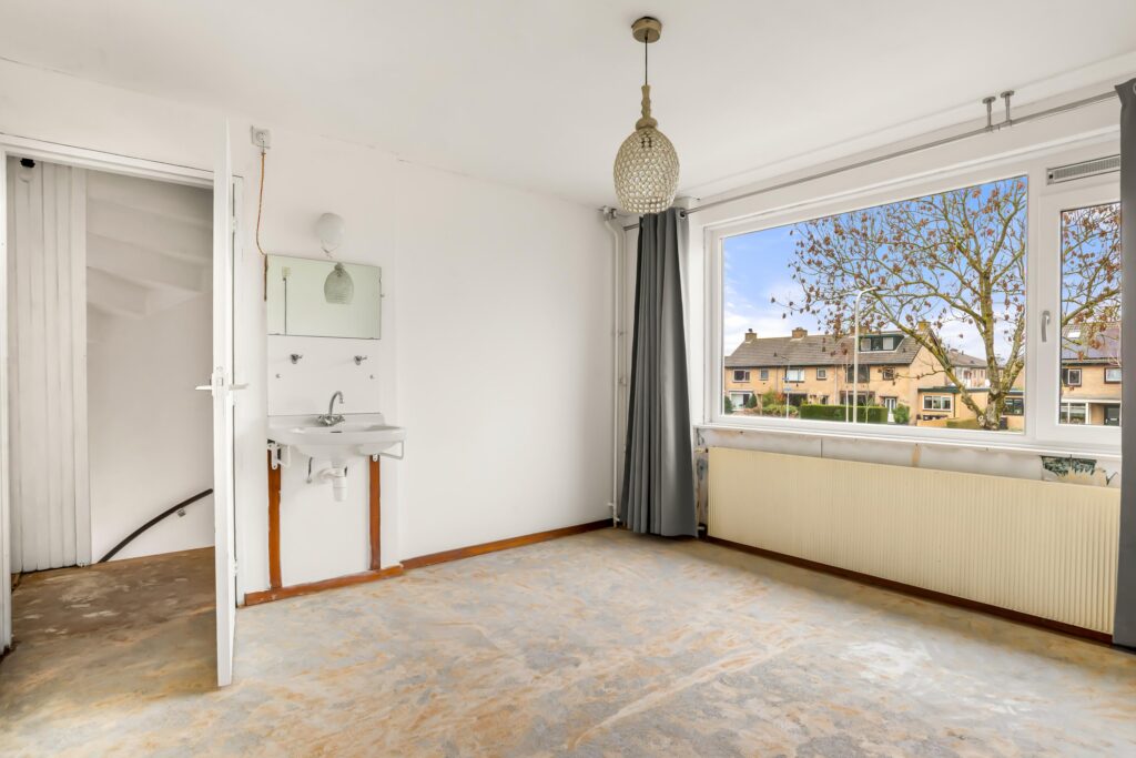 Op de eerste verdieping bevinden zich drie slaapkamers en een gedateerde badkamer. Het behang is al verwijderd, zodat u kunt kiezen voor strak stucwerk of nieuw behang. De badkamer biedt voldoende ruimte voor een moderne indeling met een inloopdouche, wastafelmeubel en toilet.