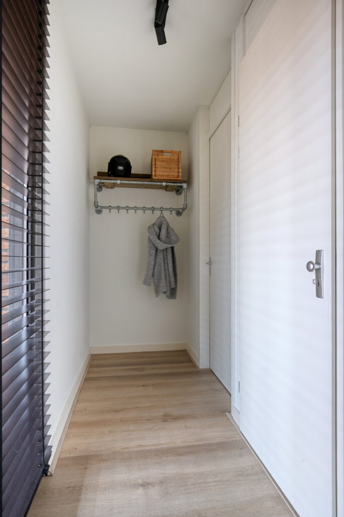 De ruime, L-vormige hal van de woning is afgewerkt met een PVC-vloer (over een bestaande tegelvloer) en voorzien van garderoberuimte en de meterkast (met o,a. een uitgebreide groepenkast, de stadsverwarmingsunit en de glasvezelaansluiting).