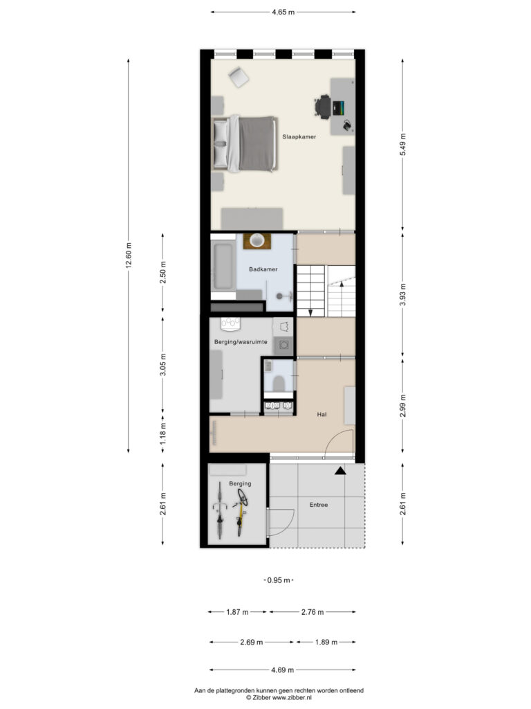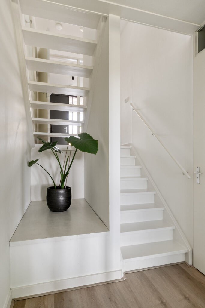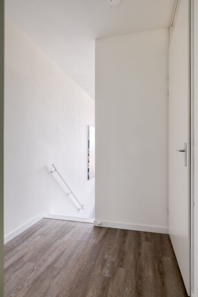 Tevens bevindt zich hier een inpandige berg-/wasruimte, het toilet en de toegang tot het afgesloten trappenhuis naar de beneden- en bovenverdieping.