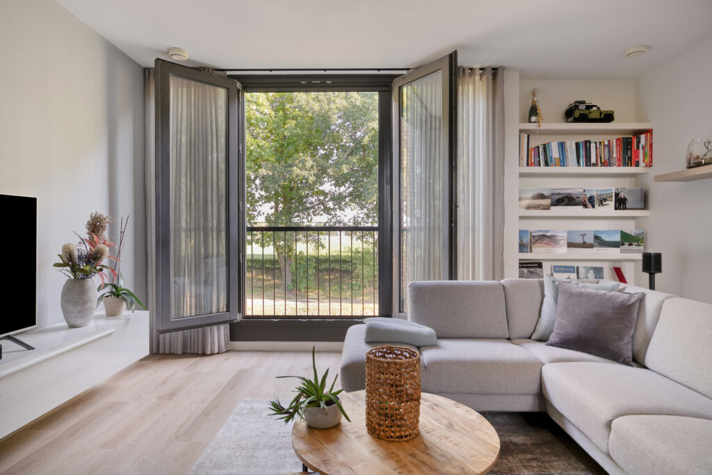Deze sfeervolle en lichte woonkamer is ook weer afgewerkt met een PVC-vloer en voorzien van een nisje met leg-/boekenplanken en een frans balkon met grote raampartijen en een dubbele draai-/kiepdeur met een plisséhor, welke u een vrij uitzicht biedt op het achtergelegen groen.