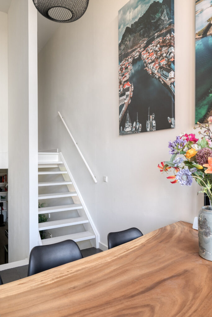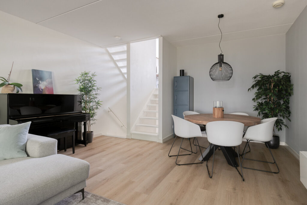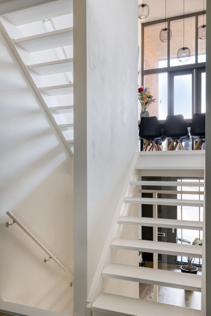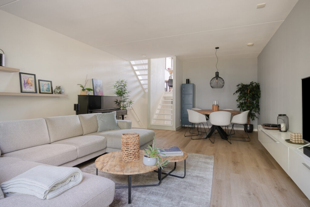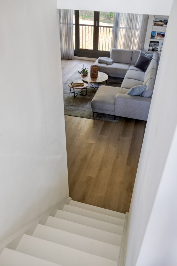 Vanaf de trapopgang betreedt u hier direct de royale woonkamer (van ± 36 m²) aan de achterzijde van de woning.