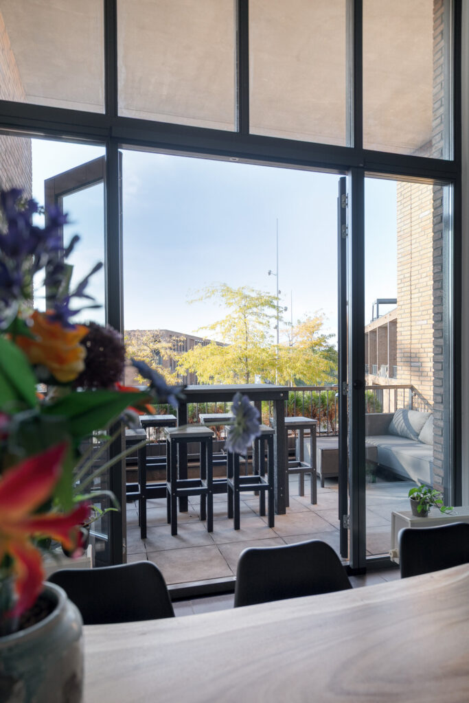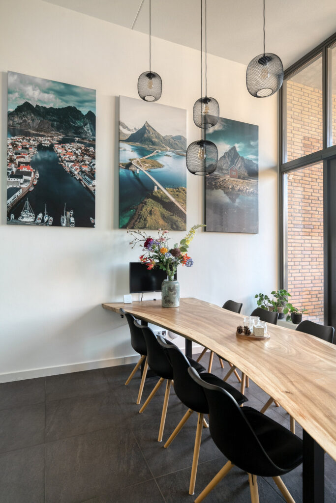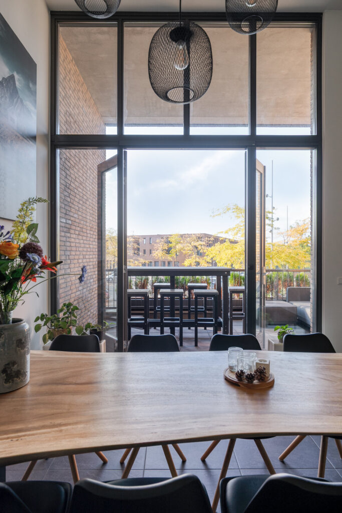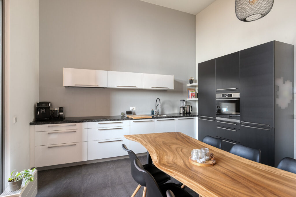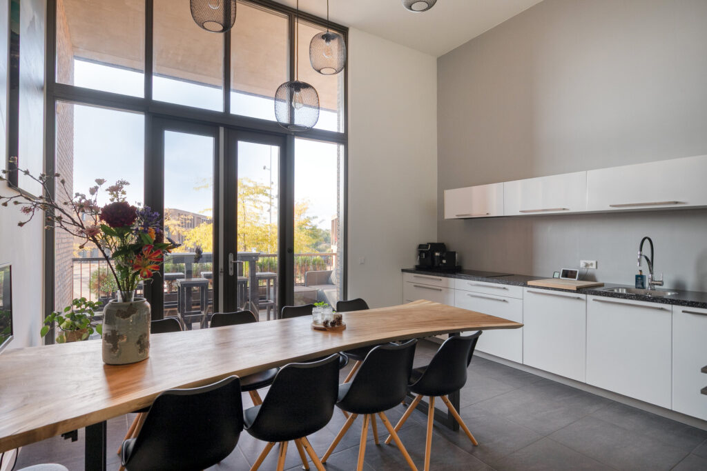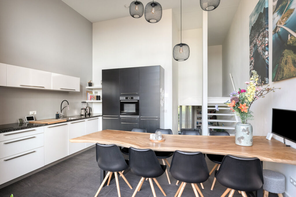 Deze riante woonkeuken (van ± 20 m²) heeft een plafondhoogte van maar liefst 4,12 meter (!), wat tezamen met de even hoge raampartijen zorgt voor een extra ruimtelijk effect en veel daglichttoetreding.