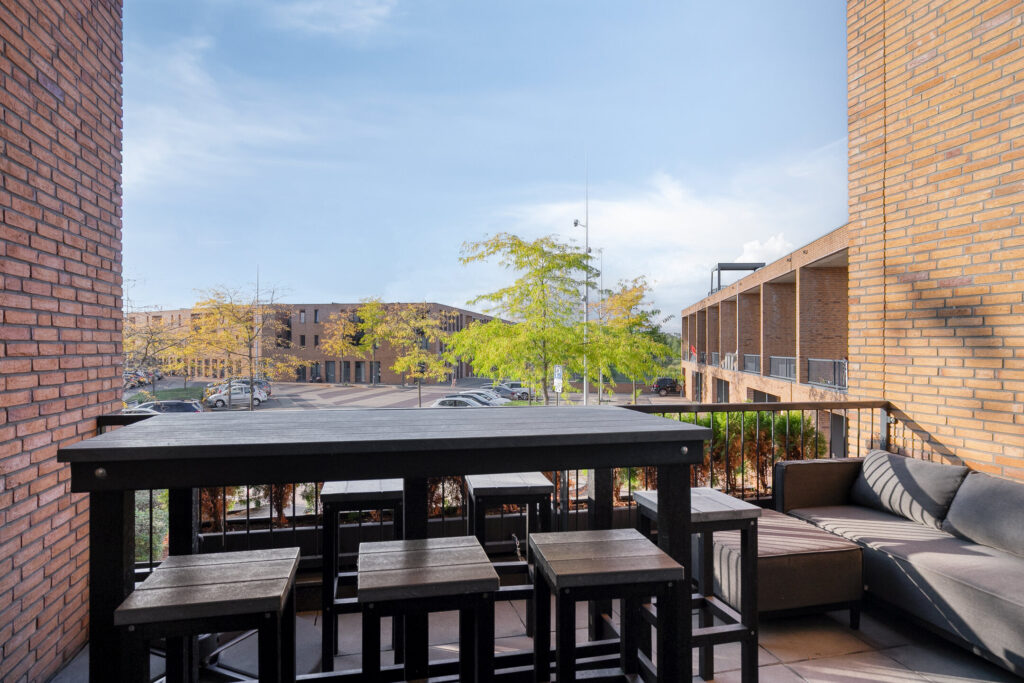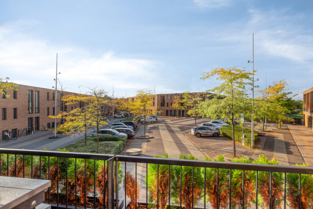 Middels de 2 openslaande deuren in de enorme pui aan de voorzijde van de keuken, welke voorzien is van een dubbel plisséhor, heeft u toegang tot de gezellige, solitaire loggia met een betontegelvloer, een stalen balkonhek met plantenbakken en een buitenlamp tegen de gevel van de woning. Hier kunt u heerlijk en rustig buiten zitten, met een vrij uitzicht over de openbare ruimte en parkeerplaatsen.