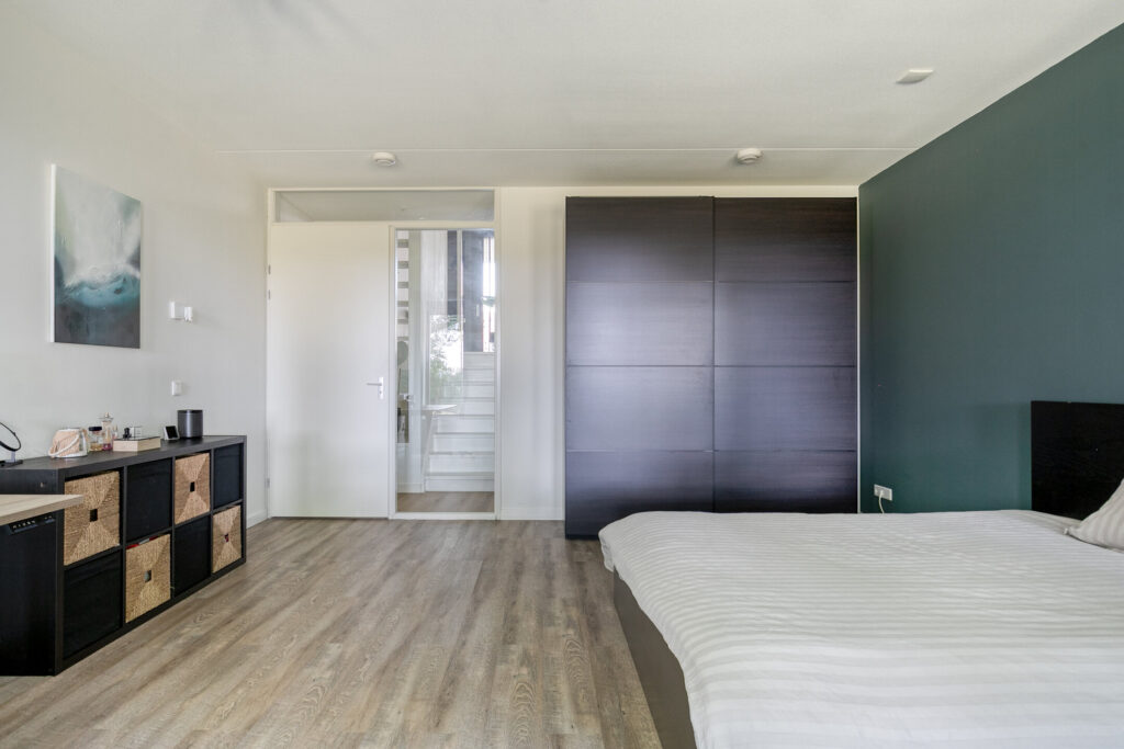 De royale master bedroom (van ruim 25 m²) aan de achterzijde van de woning is eveneens afgewerkt met een PVC-vloer en voorzien van hardhouten (draai-/kiep)ramen met hardstenen vensterbanken en manueel bedienbare rolluiken.