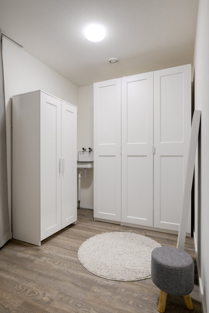 De berg-/wasruimte is eveneens afgewerkt met de voornoemde PVC-vloer en voorzien van de WTW-installatie, de verdeler t.b.v. vloerverwarming (met 9 circuits), mechanische ventilatie en aansluitingen t.b.v. de wasapparatuur.
