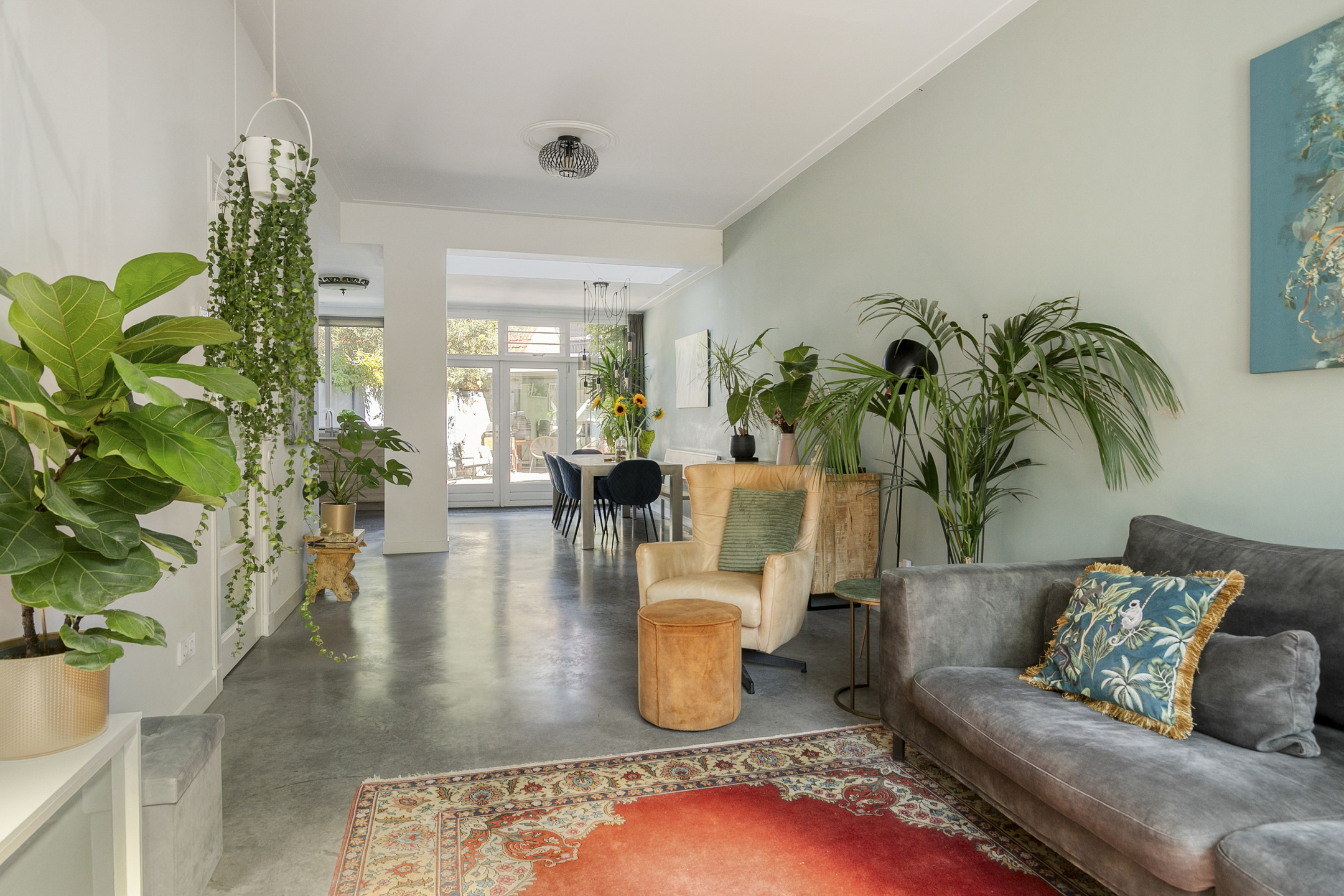 Woonkamer met eet- en zitgedeelte. Aan de achterzijde is de woning over de volledige breedte uitgebouwd, waardoor er een ruime woon-/leefkeuken is gecreëerd. De vernieuwde keuken, geplaatst in hoekopstelling, is voorzien van inbouwapparatuur, te weten: een vaatwasmachine, inductiekookplaat, combi-oven/magnetron, afzuigkap en kokendwaterkraan. Er is voldoende ruimte voor het plaatsen van een Amerikaanse koelkast. Naast de keuken ligt tevens een praktische kelder-/provisiekast. Aan de achterzijde geeft een compleet open te vouwen harmonica pui toegang tot de tuin.