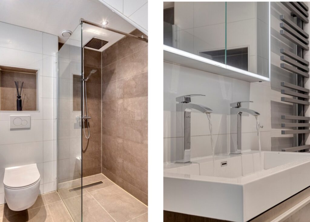 De moderne badkamer (2020) beschikt over een ruime inloopdouche met regen- en handdouche, toilet, dubbele wastafel en handdoekradiator.