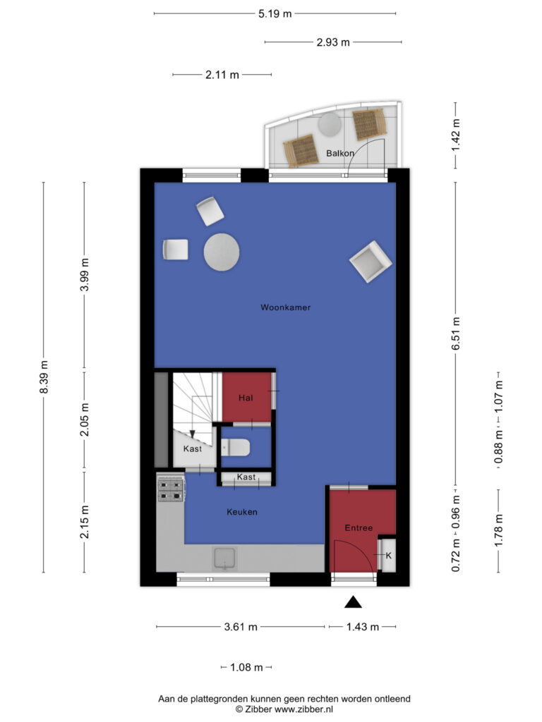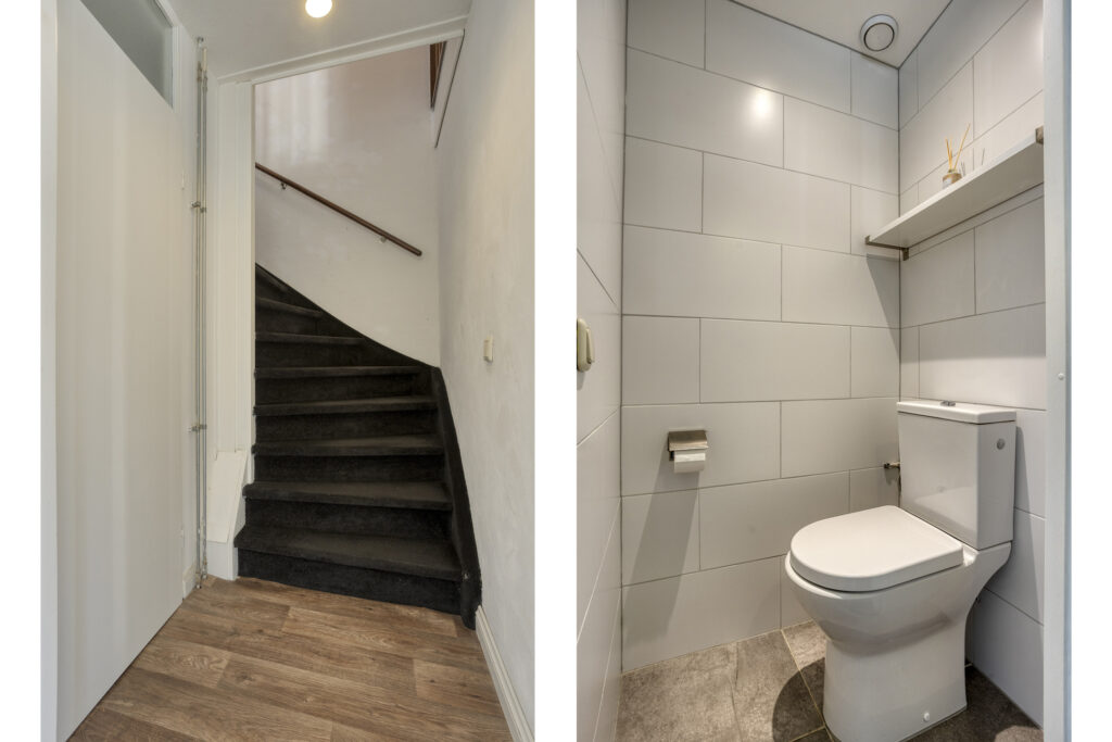 Middels het portaal waar tevens de toiletruimte gesitueerd is is de trapopgang naar de eerste verdieping toegankelijk.