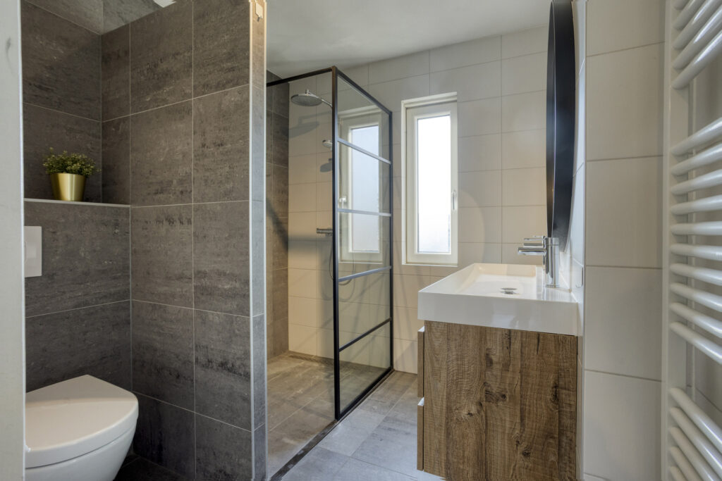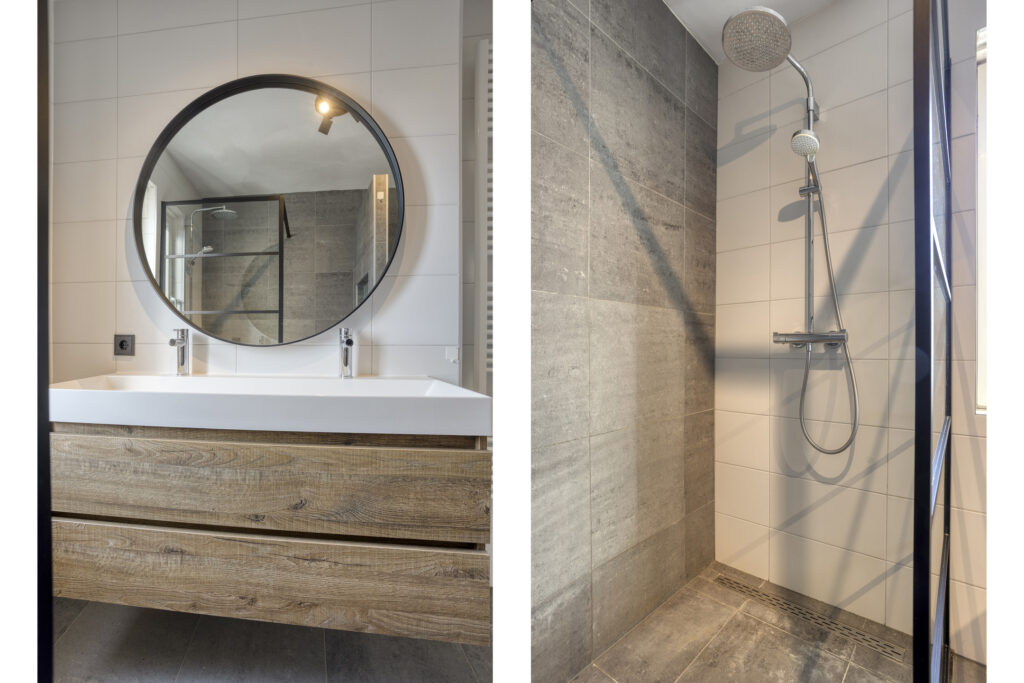 De luxe en modern uitgevoerde badkamer is in 2021 geheel vernieuwd. Deze geheel betegelde badkamer beschikt over een ruime inloopdouche, brede, dubbele wastafel met meubel en spiegel met inbouwverlichting, een wandcloset en designradiator.