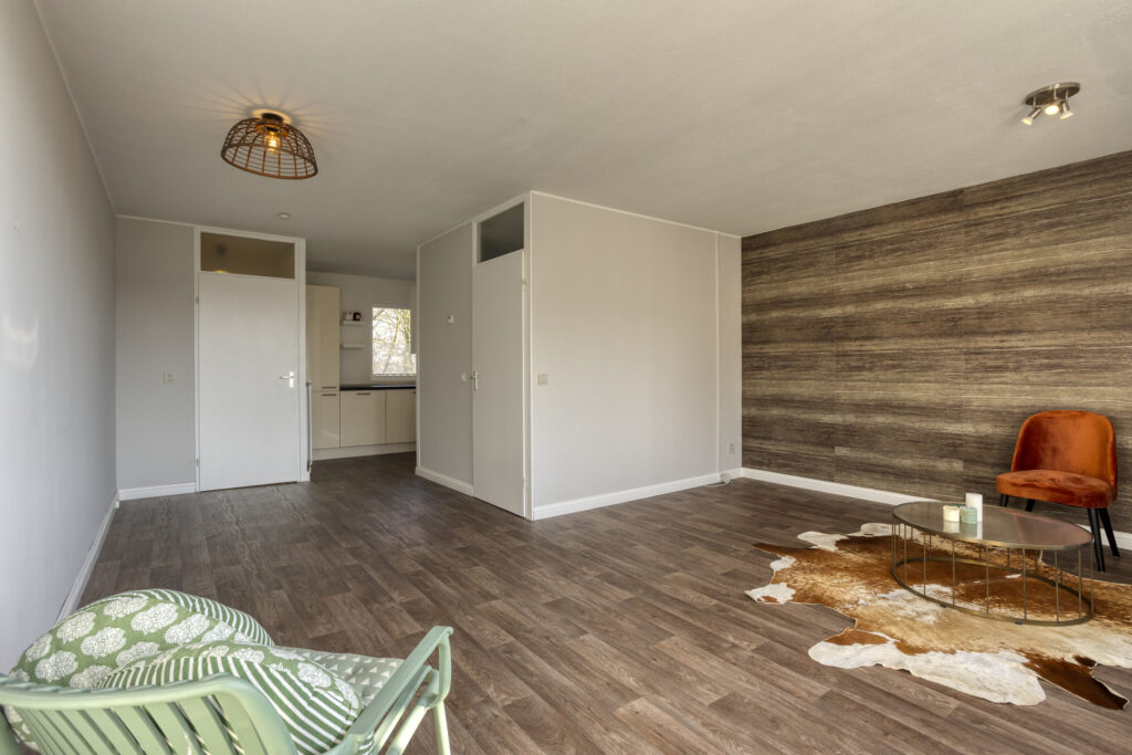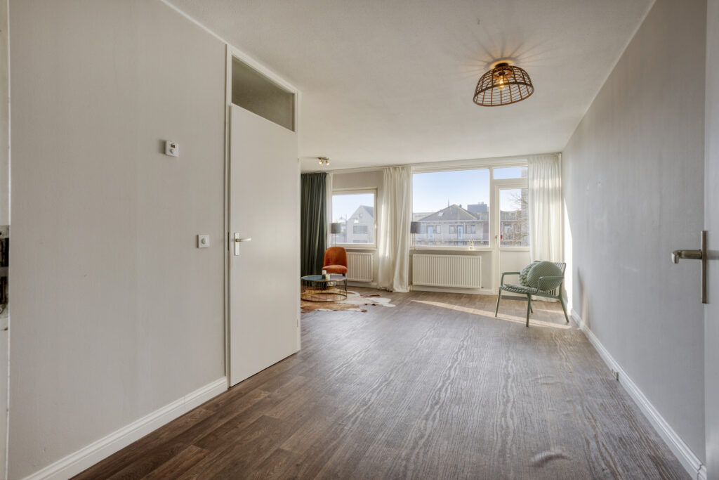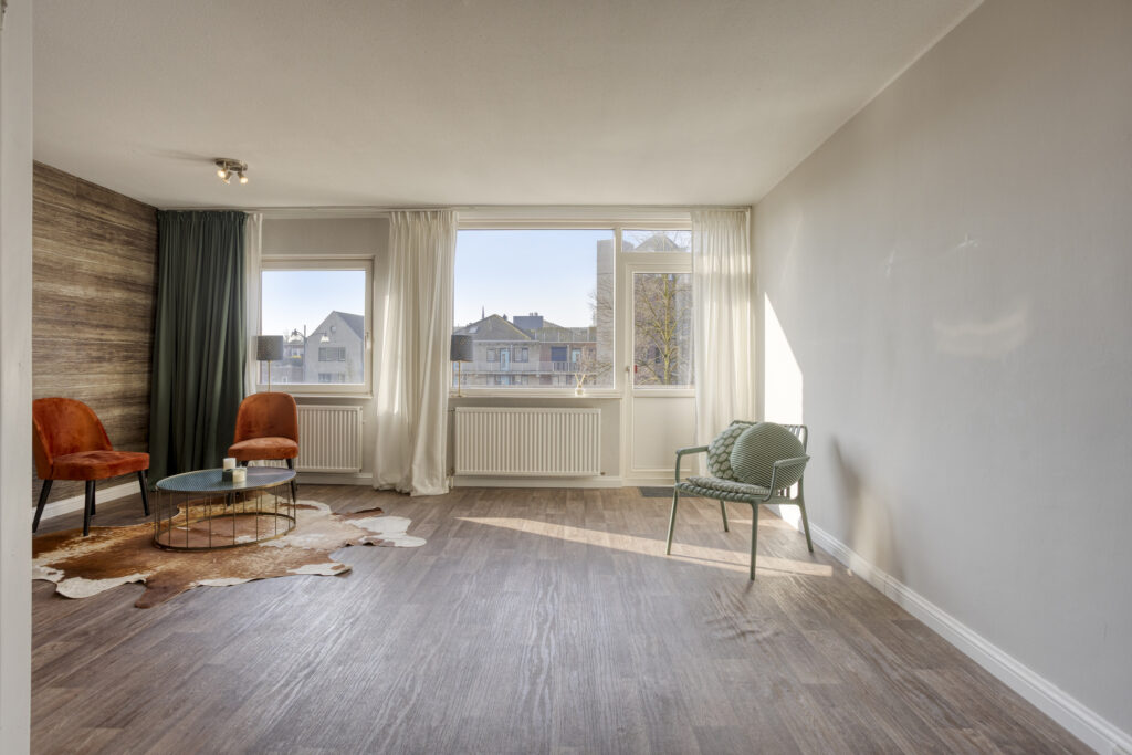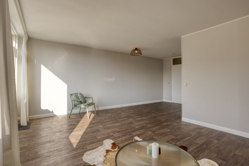De ruime en lichte woonkamer geniet door zijn ligging op het zuiden een fijne lichtinval. De vloer is afgewerkt met vinyl en via een openslaande deur is het balkon op het zuiden bereikbaar. Dit balkon is een heerlijke plek om buiten te kunnen genieten van een kopje koffie of thee in de zon.