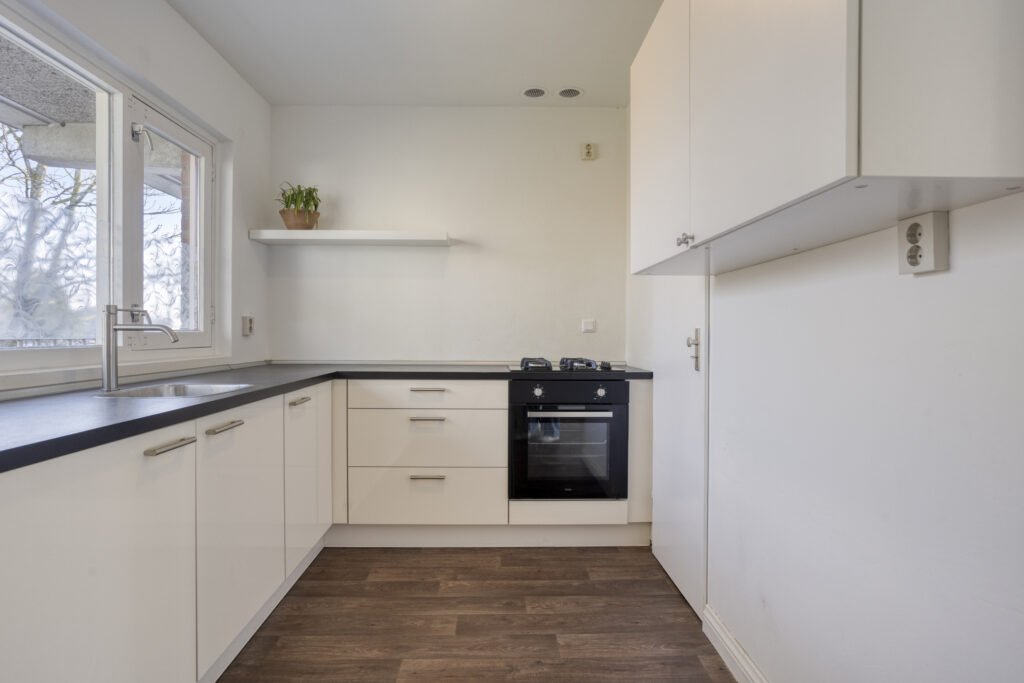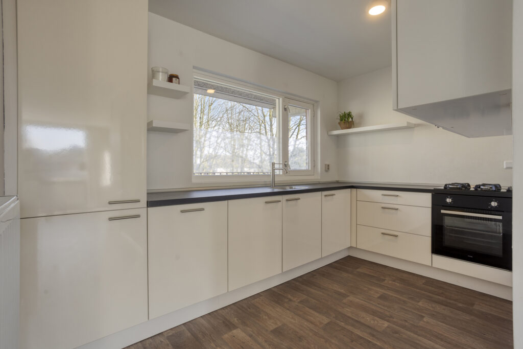 De keuken is gelegen aan de voorzijde in de half open keuken. De keuken is geplaatst in een L-opstelling en beschikt over een 4-pits gaskookplaat, koelkast, vrieskast, oven en een vaatwasser. De diverse kasten en lades zorgen voor extra bergruimte. Tevens is de praktische trapkast bereikbaar vanuit de keuken voor extra opslag.