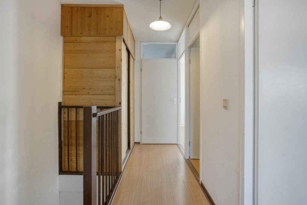 De overloop met laminaatvloer geeft toegang tot een drietal slaapkamers, een kastenkamer, stookruimte en badkamer.