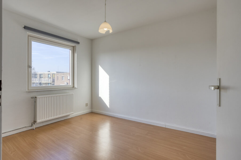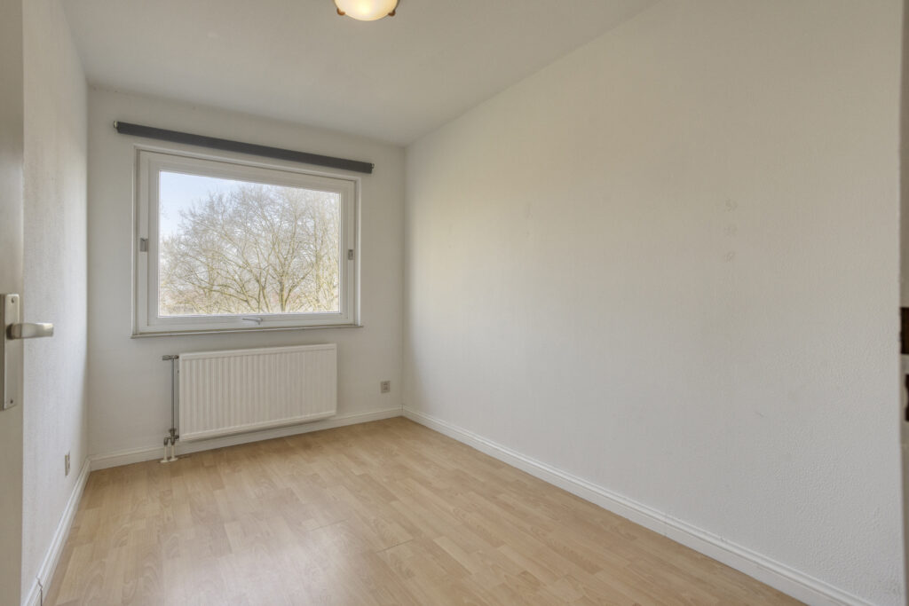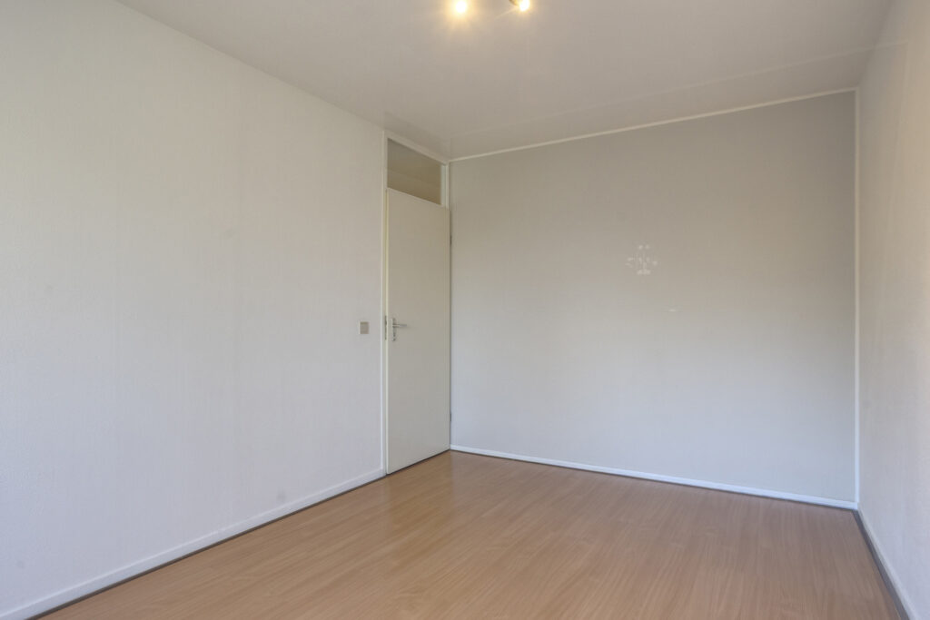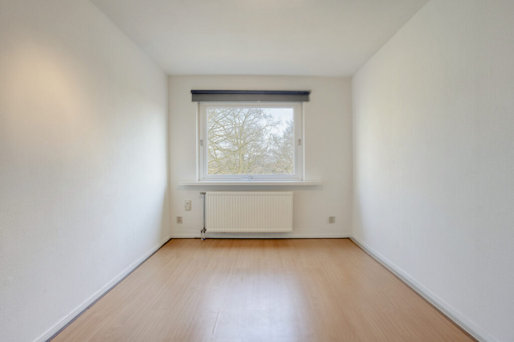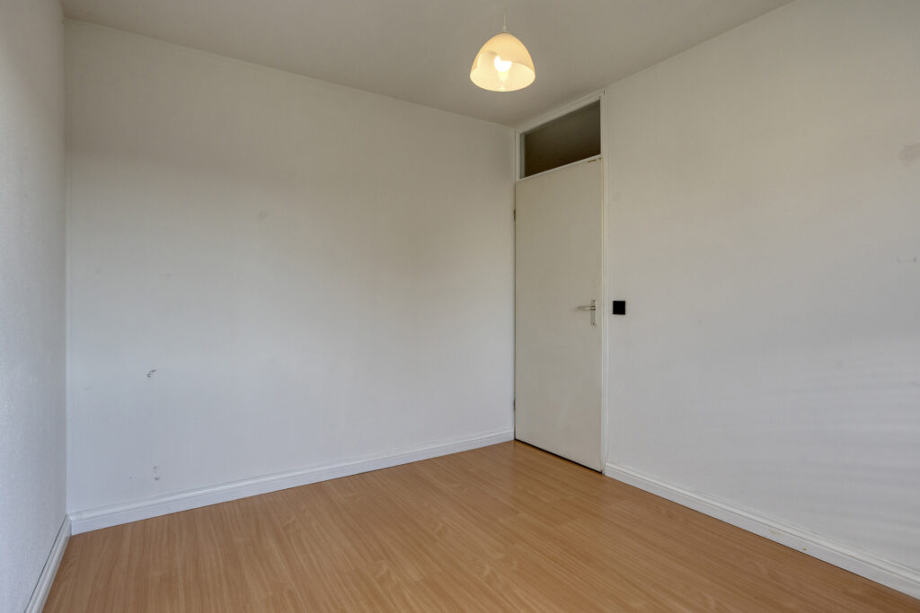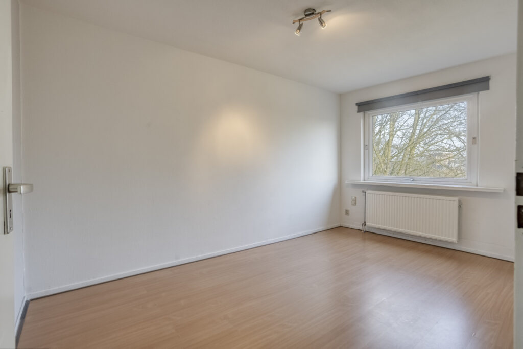 Slaapkamer 2 is gelegen aan de voorzijde en beschikt eveneens over een laminaatvloer, enkele beglazing en houten kozijnen.